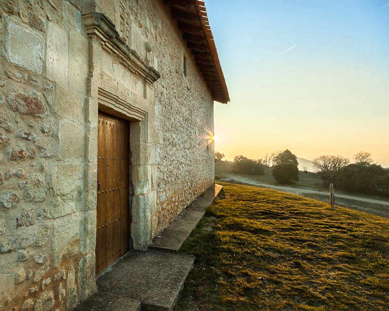 Debajo está la ermita de Beolarra que, desde la posición en que estábamos se ve a la contra del amanecer. Unos minutos antes de salir el Sol, por el Oeste, el cielo se tiñe de magenta.