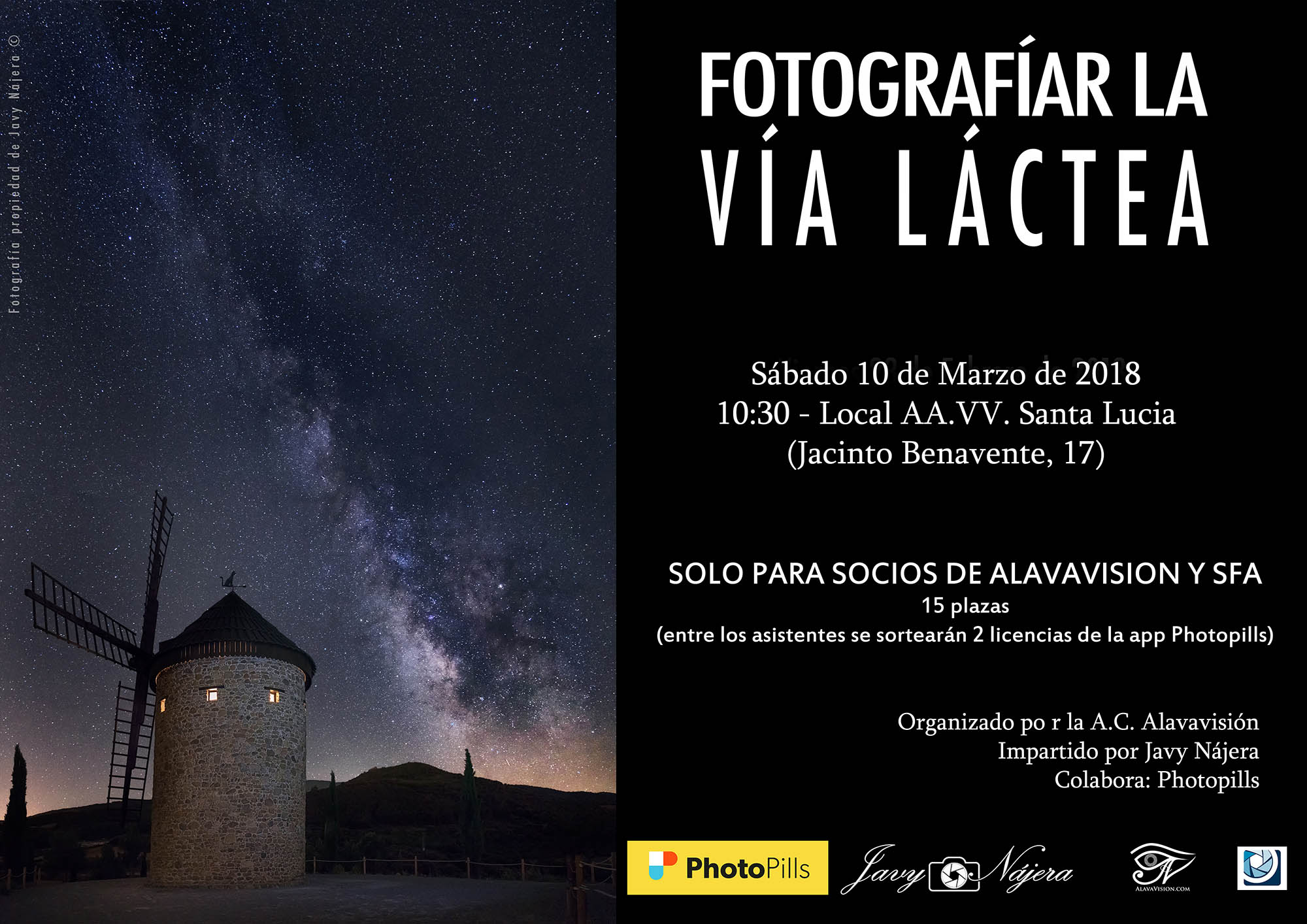 Gracias a la aportación de nuestro socio Javy Nájera, el sábado 10 de marzo realizaremos un taller de cómo fotografiar la Via Láctea, tanto su ejecución como su planificación.